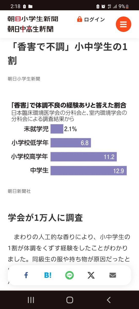 香りの害による体調不良の数の多さに驚愕。小学生中学生が可哀想。気づかない人もいますが、敏感な人や化学物質過敏症を発症した人には息もできない苦しさ。頭痛や吐き気。子どもなら勉強どころでないはず。 国レベルの規制を。 CMも良くないです。規制を。 最近はヨガ教室なども注意されます。 x.com/_qco_p/status/…
